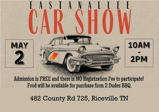 Eastanallee Car Show. Eastanallee Baptist Church, 482 County Road 725, Riceville, TN. 10am-2pm. Free admission. No Registration fee. Food available.