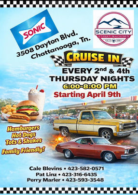 Sonic Cruise In. 3508 Dayton Blvd, Chattanooga TN. 6pm-8pm. Burgers, Hot dogs, Shakes, & Tots. Family friendly! More info: Cale 423-582-0571 or Pat 423-316-6435.